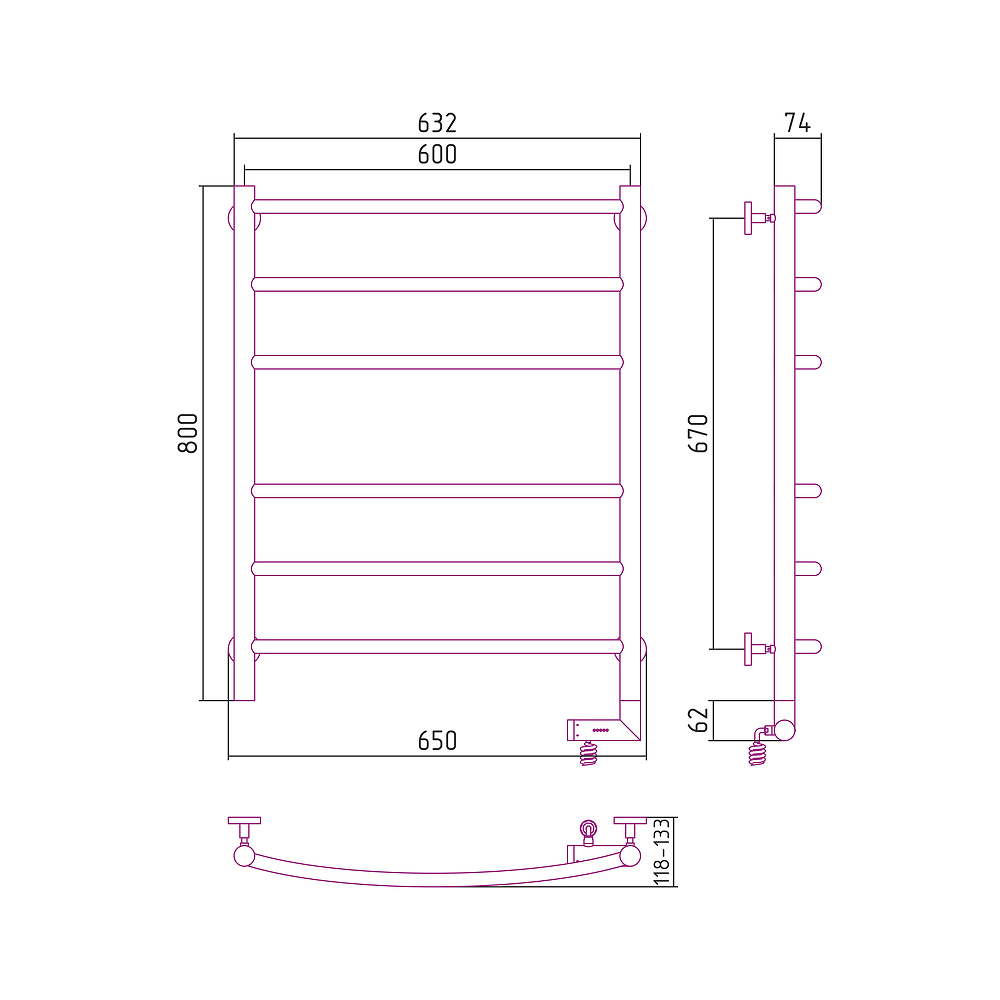 Полотенцесушитель, блок управления с кабелем, телескопические кронштейны, шестигранный ключ, дюбели и саморезы. Приобретается отдельно: модуль скрытого подключения для мэм d 28 мм