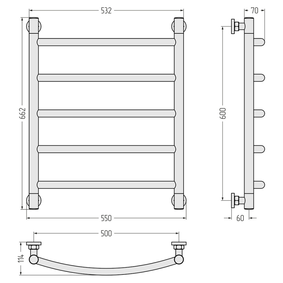 Полотенцесушитель, угловые элементы, спускной клапан, отражатели, эксцентрики и опоры кронштейнов, декоративные заглушки, комплект прокладок, шестигранные ключи, дюбели и саморезы