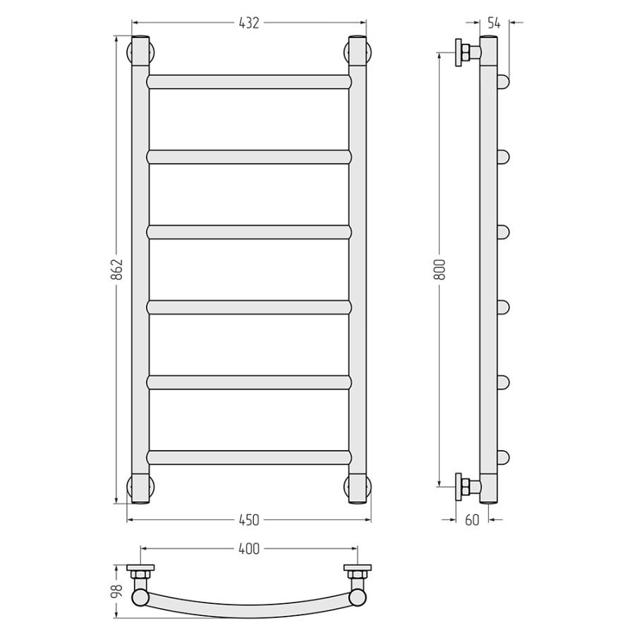 Полотенцесушитель, угловые элементы, спускной клапан, отражатели, эксцентрики и опоры кронштейнов, декоративные заглушки, комплект прокладок, шестигранные ключи, дюбели и саморезы