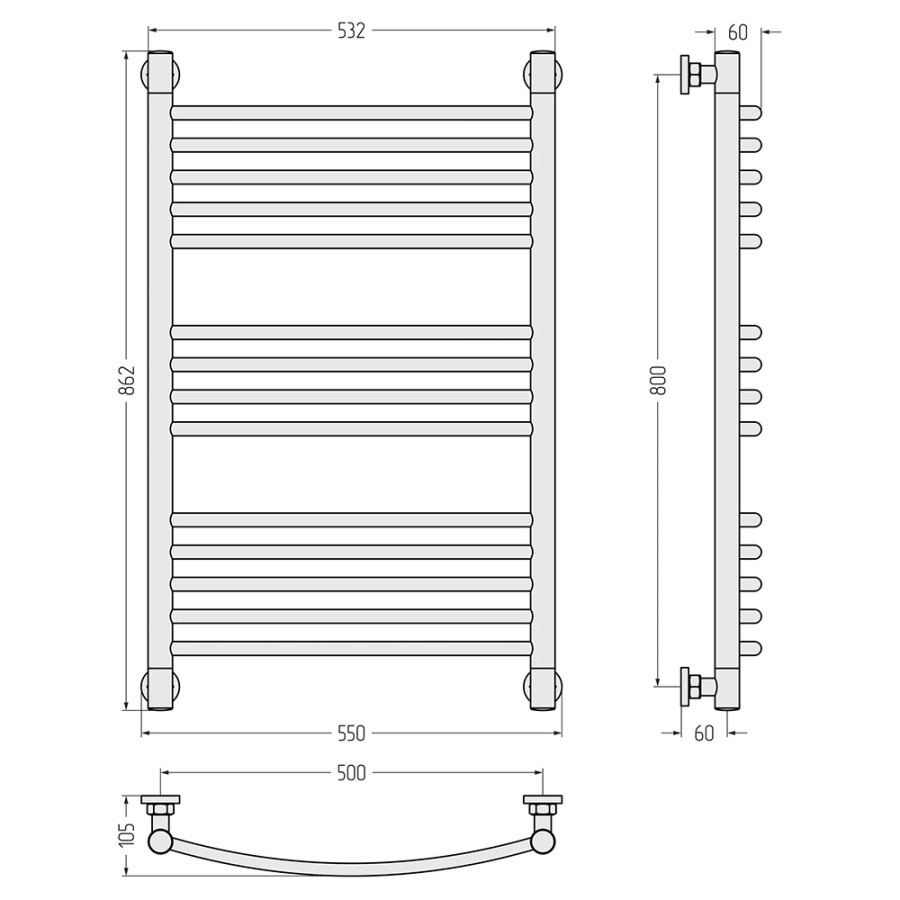 Полотенцесушитель, угловые элементы, спускной клапан, отражатели, эксцентрики и опоры кронштейнов, декоративные заглушки, комплект прокладок, шестигранные ключи, дюбели и саморезы
