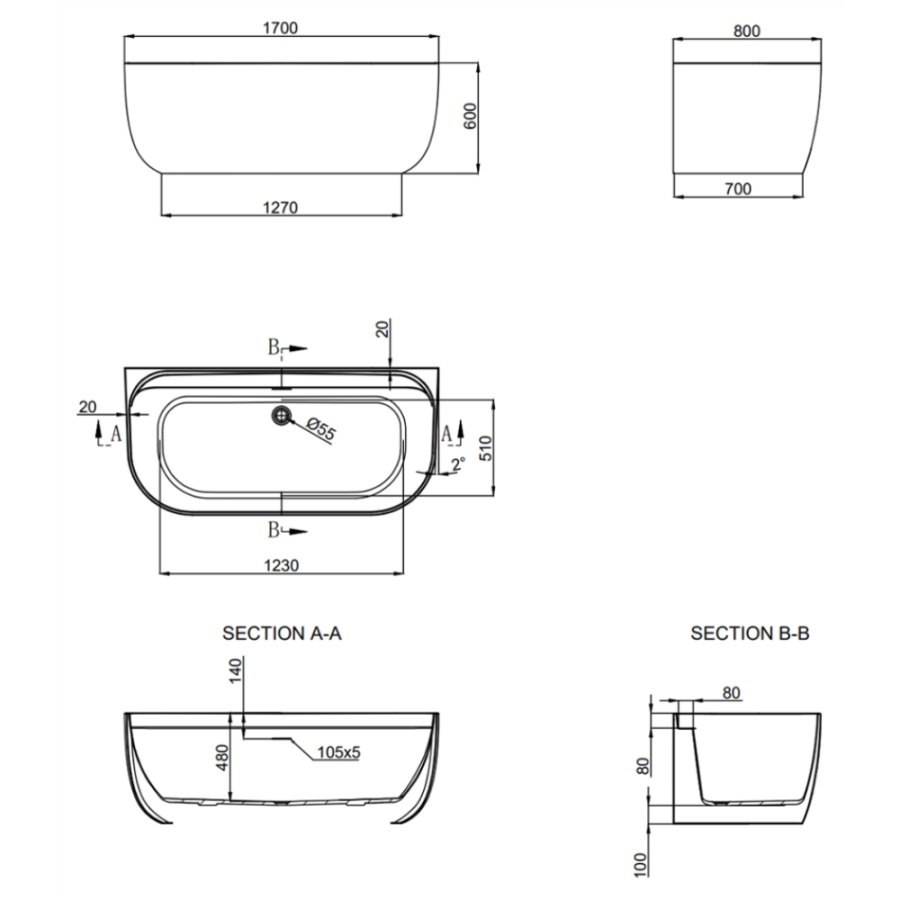 Акриловая ванна AVS Артемида 170x80 белая с сливом-переливом и донным клапаном