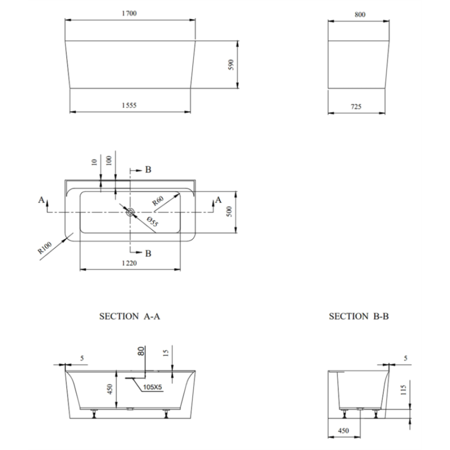 Акриловая ванна AVS Сканди 170x80 белая с донным клапаном