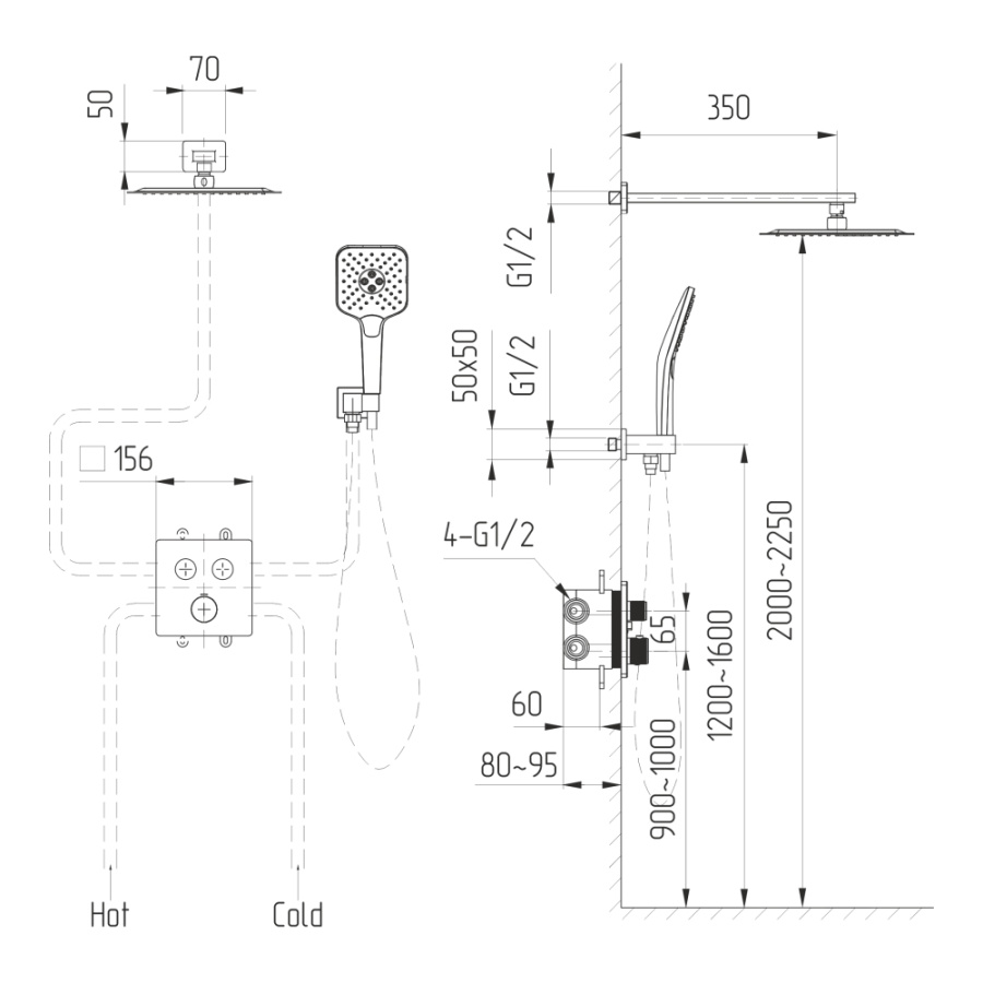 термостат; монтажный блок; верхний душ; кронштейн верхнего душа; ручной душ; душевой шланг; настенный держатель; инструкция.