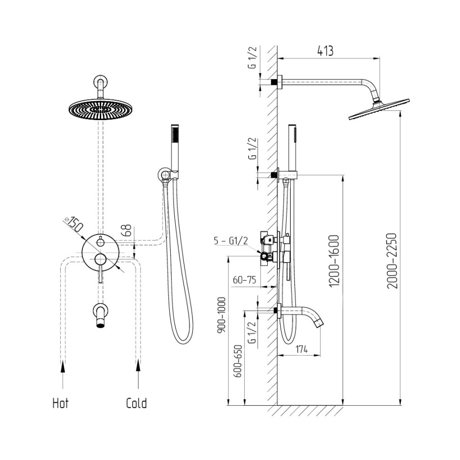 смеситель; монтажный блок; верхний душ; кронштейн верхнего душа; ручной душ; душевой шланг; настенный держатель; излив; инструкция.
