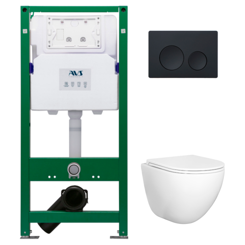 Комплект AVS 3в1: Инсталляция для унитаза 809-0006-7732C + Унитаз подвесной 801-0045-P-T2-GW + Клавиша смыва 809-0012-MB черная, круглые кнопки