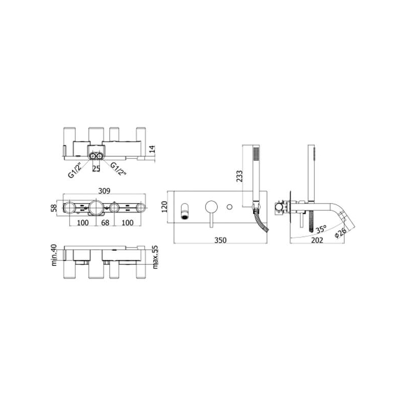 Наружняя часть смесителя;скрытая монтажная часть; душевая лейка; шланг.