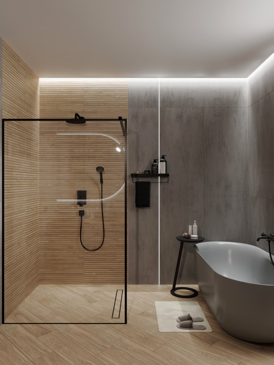 В этом проекте цветная сантехника от Аквамир прекрасно сочетается с текстурами бетона и дерева. Акриловая ванна AVS Сильва, подвесной унитаз Спектр и раковина AVS - все в благородном сером матовом цвете.