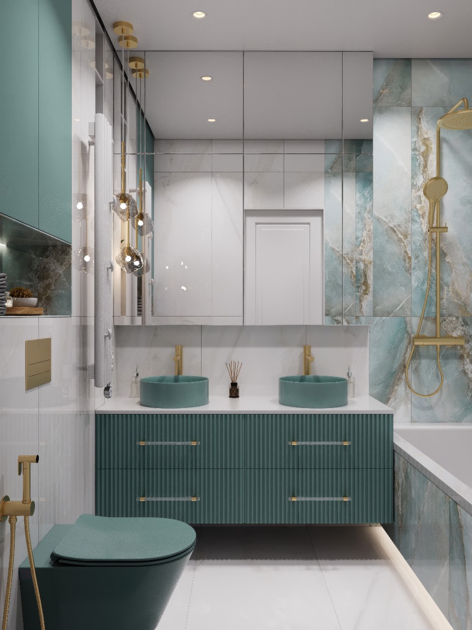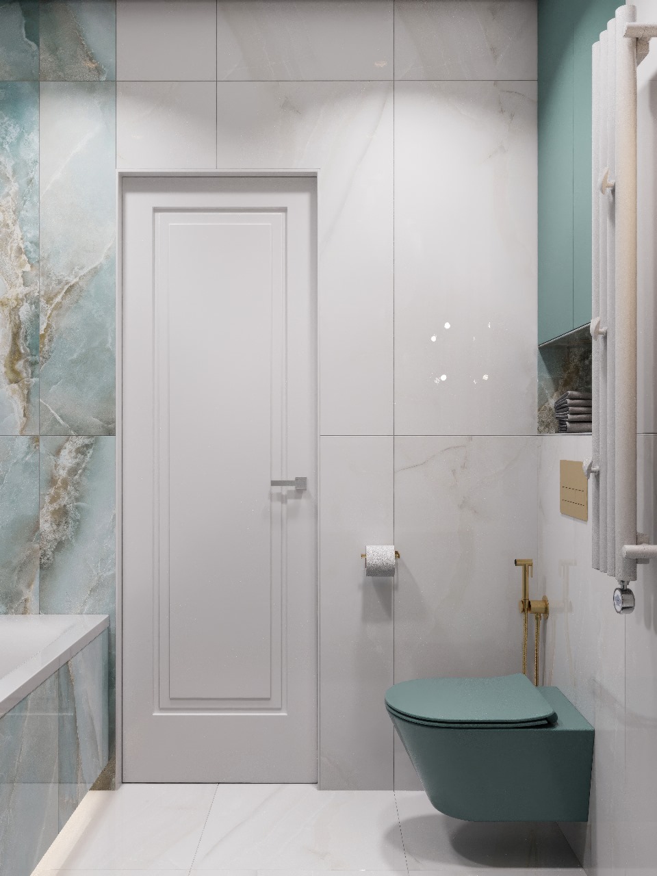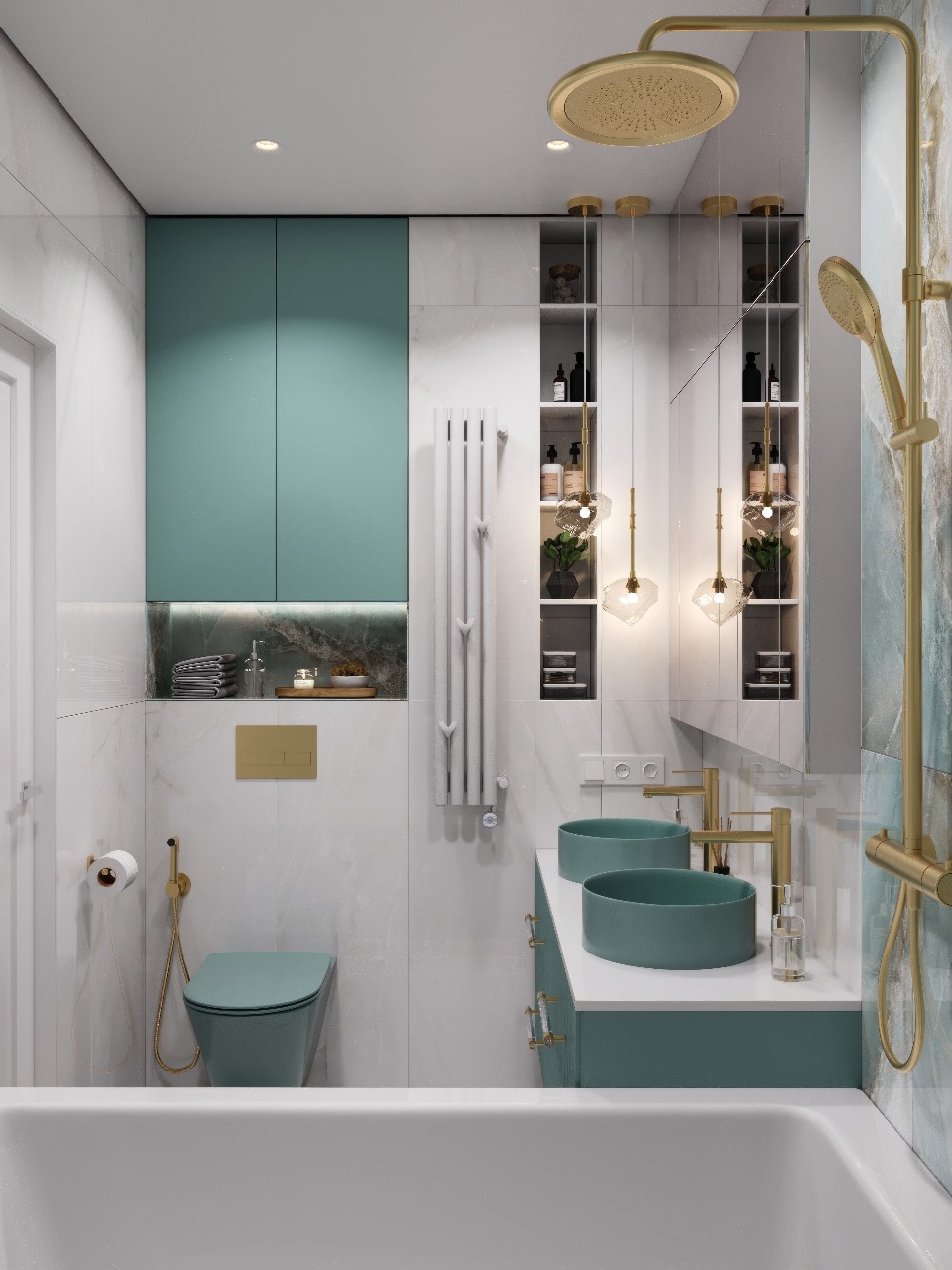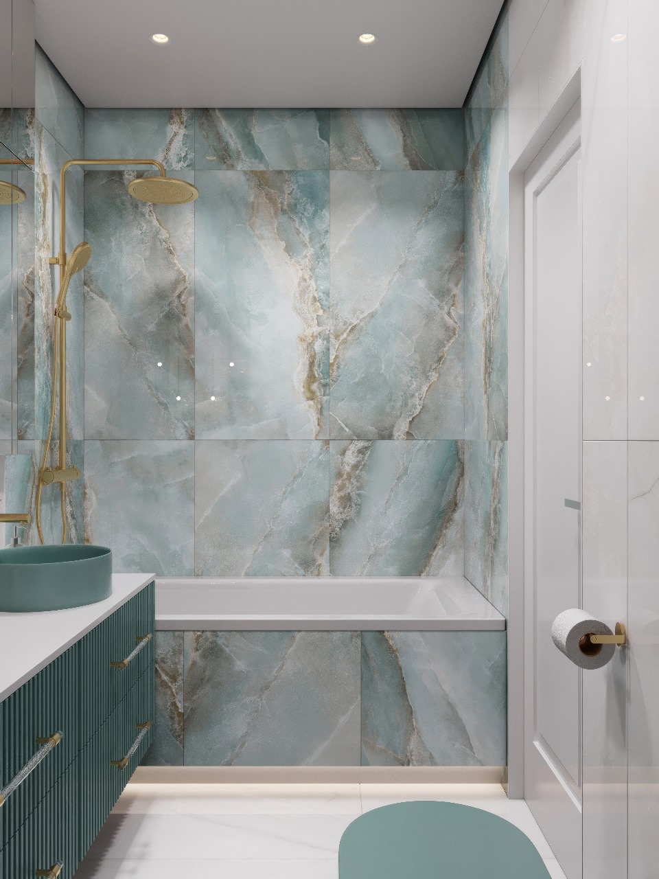 Сложный оттенок сантехники AVS в цвете Тиффани - эффектный акцент, который привносит в ванную комнату легкость и благородство. Золотые аксессуары бренда AVS также добавили роскоши в интерьере ✨ А керамогранит в двух оттенках LCM Blumarin Lagoon и LCM Snow Onyx завершил и собрал воедино всю концепцию интерьера ванной комнаты!