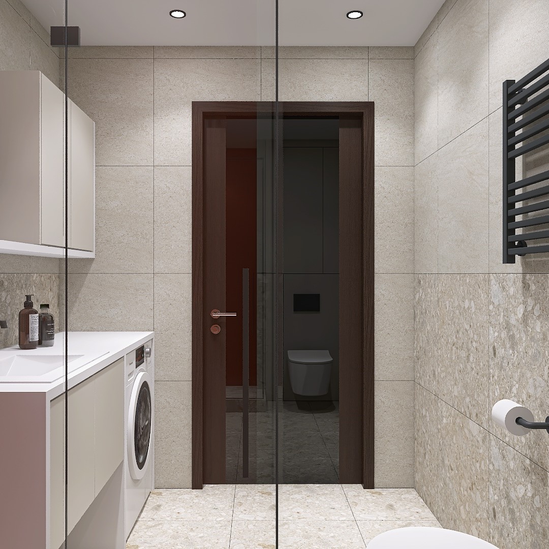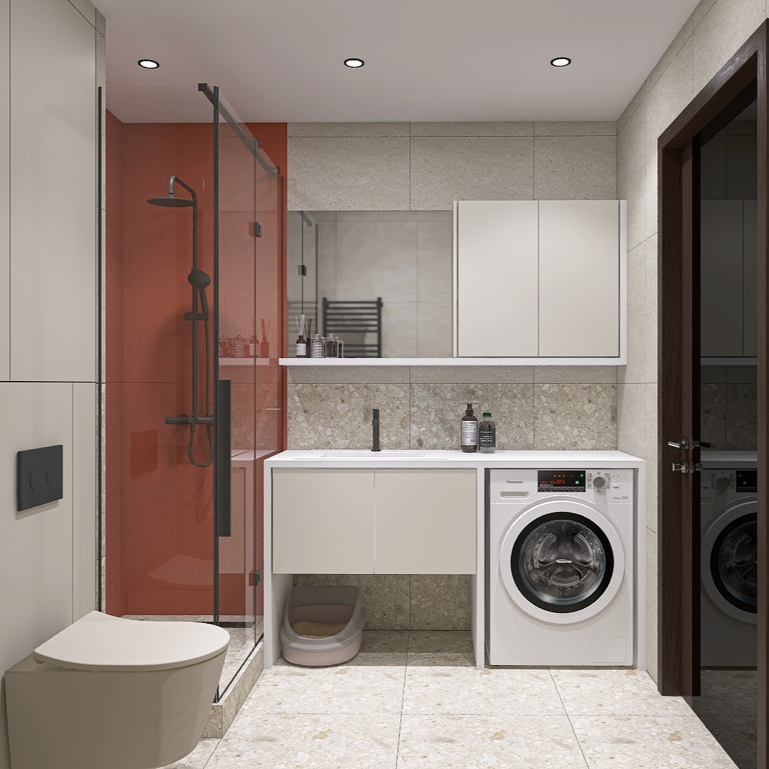 Так родился проект "Equilibrium" (равновесие). Основой стала бежево-серая плитка, имитирующая природный камень, - она создавала уют и ощущение стабильности. Душевая была выделена терра- котовым кабанчиком, который стал ярким акцентом, символизирующим энергию и творчество.