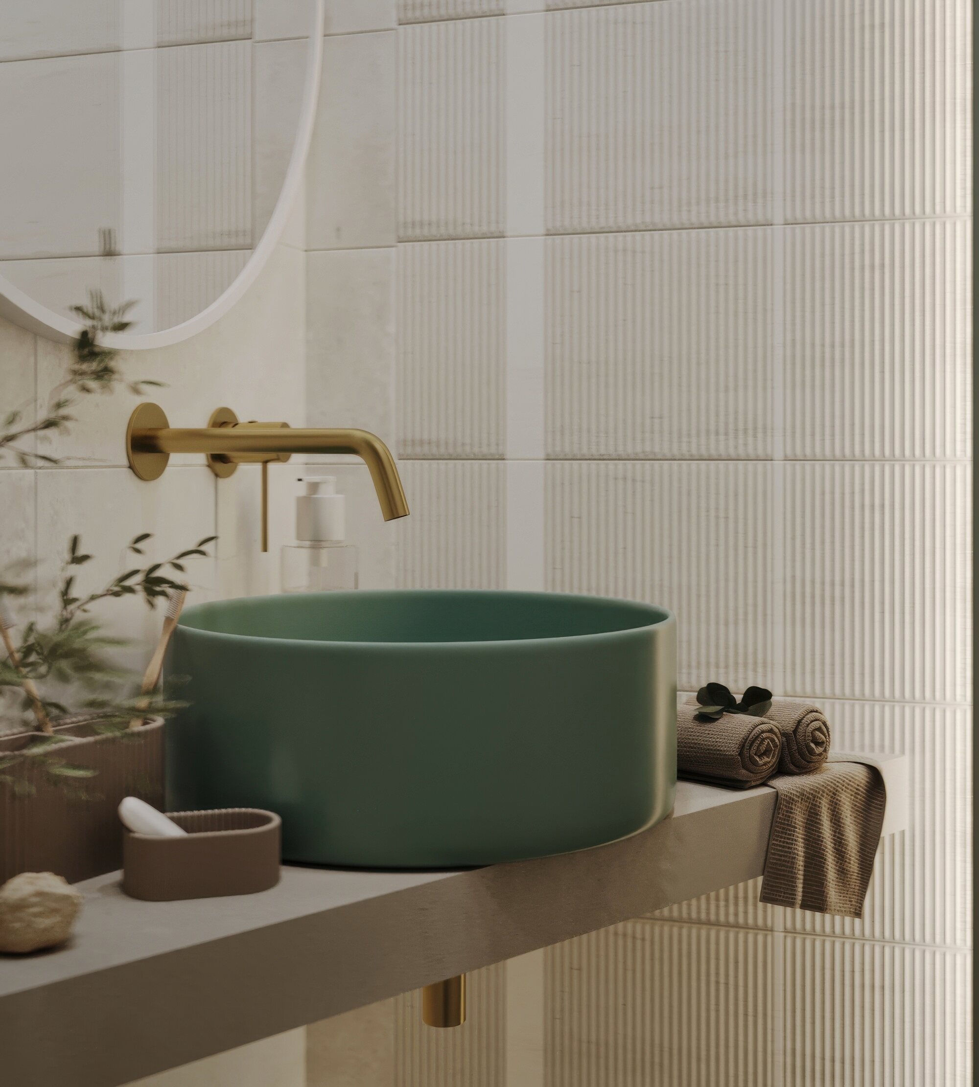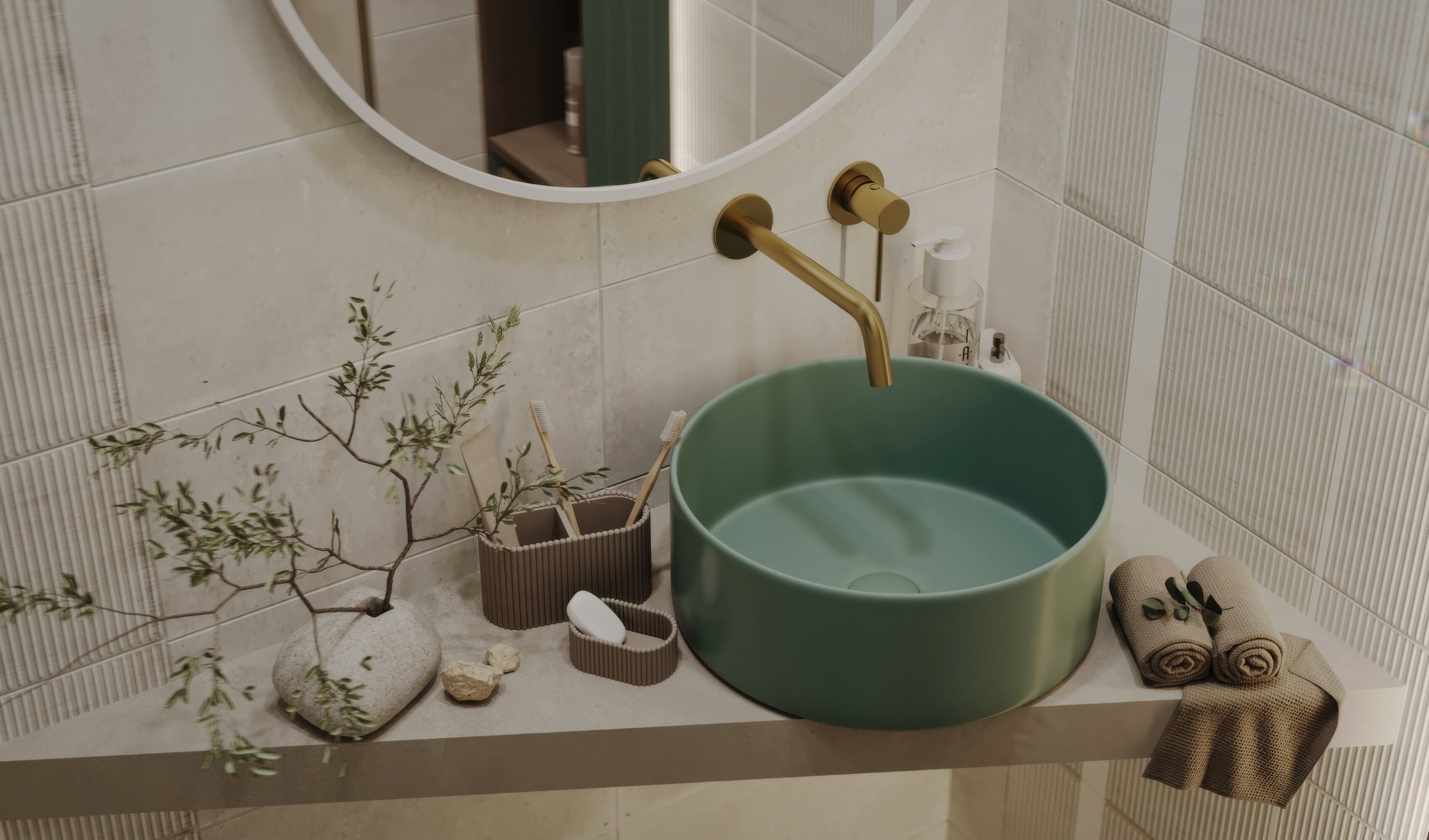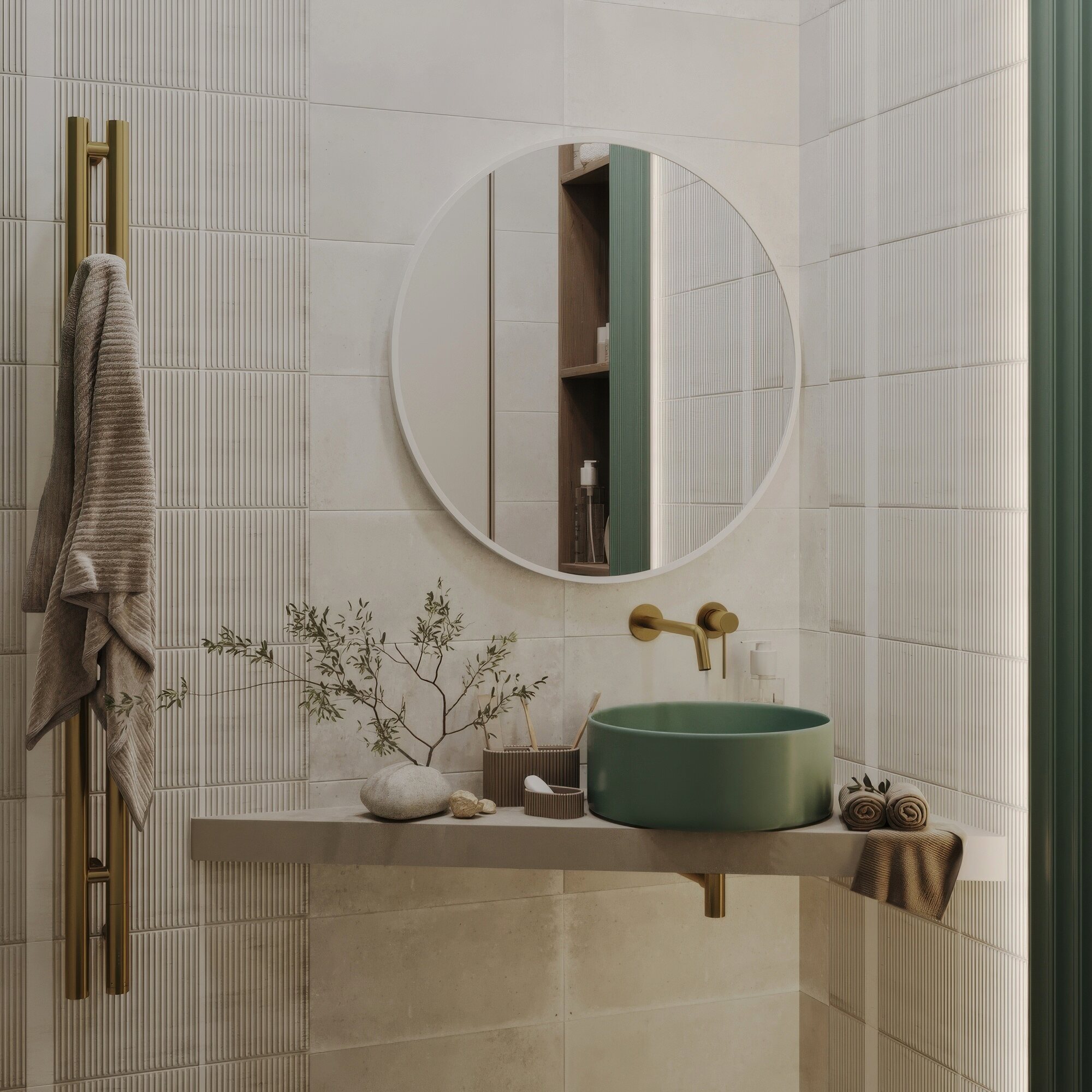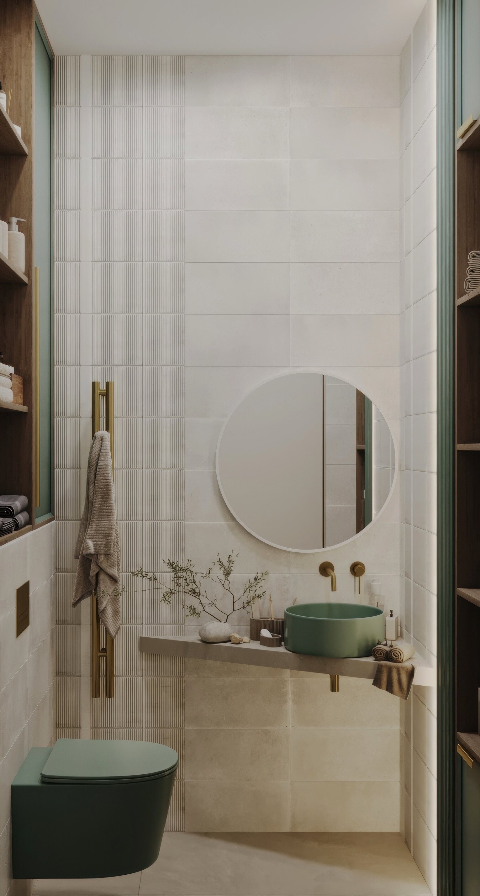 Функциональный санузел в трехкомнатной квартире ЖК «Сердце столицы», оформленный в стиле американской классики. Основной задачей было создать практичный и эстетичный интерьер, но без значительных затрат. В качестве ключевого акцента выбрана сантехника от Аквамира пастельного зеленого оттенка, который эффектно контрастирует с золотыми деталями: смесителем, кнопкой смыва и полотенцесушителем. Для оптимизации пространства спроектирована косая столешница, обеспечивающая удобное размещение сантехники и хранения. Компактный, но выразительный интерьер сочетает в себе продуманную эргономику и утонченную эстетику.