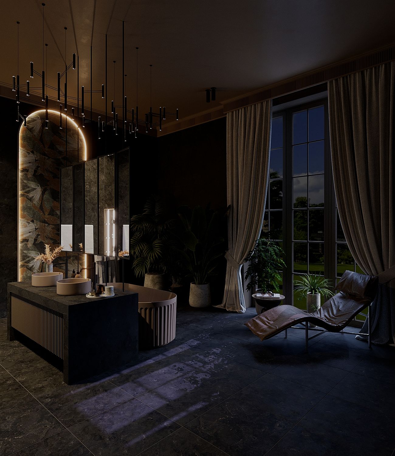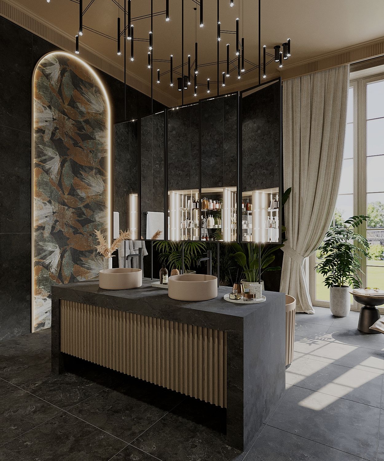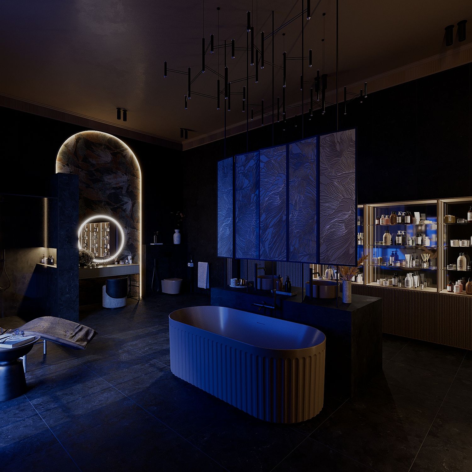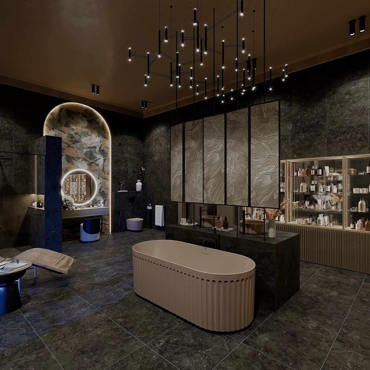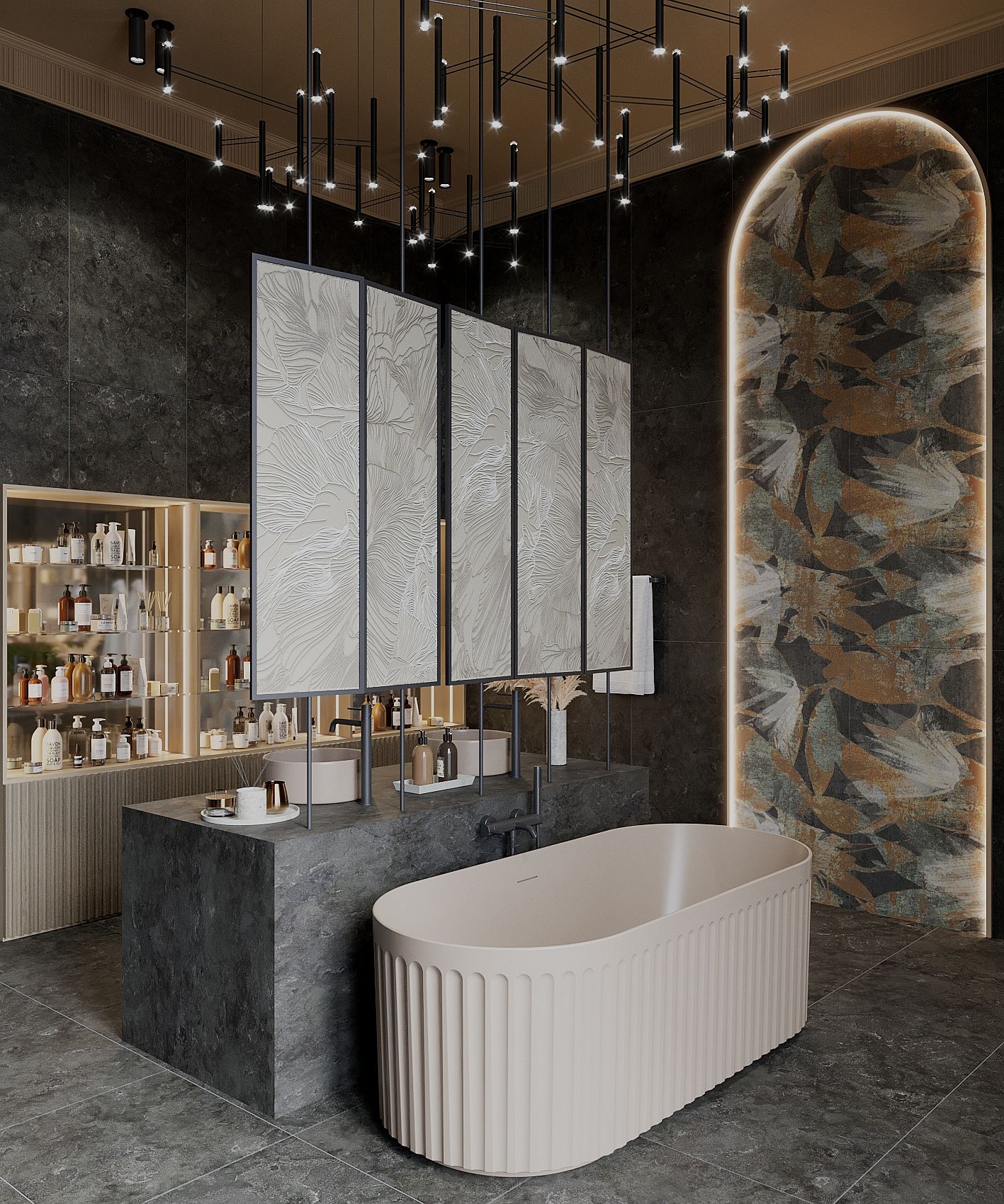 Перед Вами мастер-ванная комната при главной спальне в частном доме в городе Сочи . В своём проекте я хотел подчеркнуть масштабы помещения, выделить окно, так как окна всегда украшение любого помещения, не говоря о ванных комнатах. Сохранить простор, при этом разместить всё необходимое для своих Главных Героев. В этом как я считаю способствует уникальная не стандартная планировка.