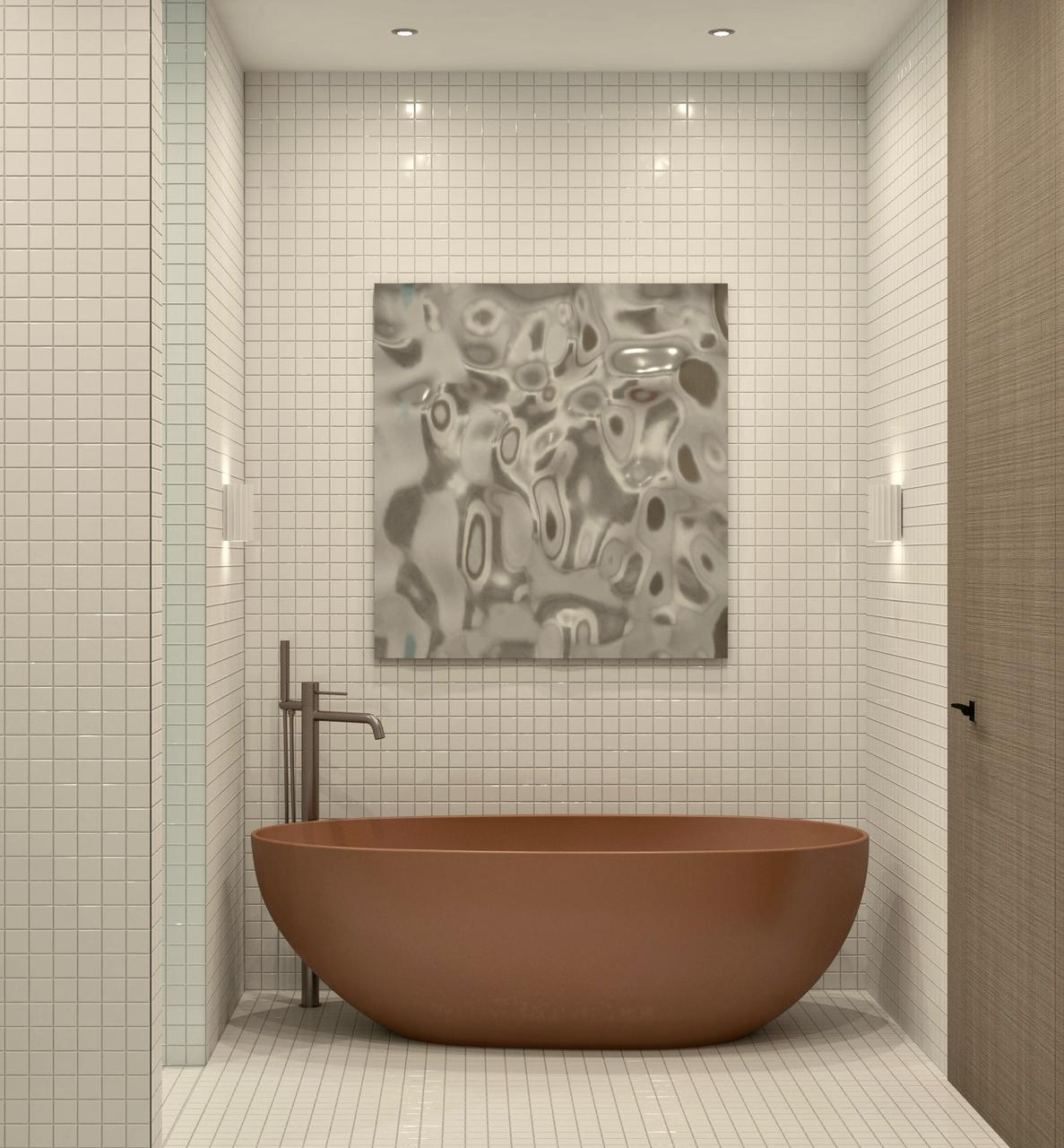 Проект "Цвет в деталях" представляет собой сочетание минимализма и ярких акцентов, создавая уникальное пространство, которое привлекает внимание и вдохновляет. Основой дизайна служит белая мелкая плитка, которая создает чистый и свежий фон, позволяя цветной сантехнике стать главным героем интерьера.