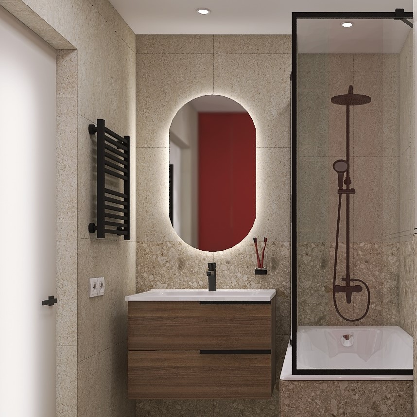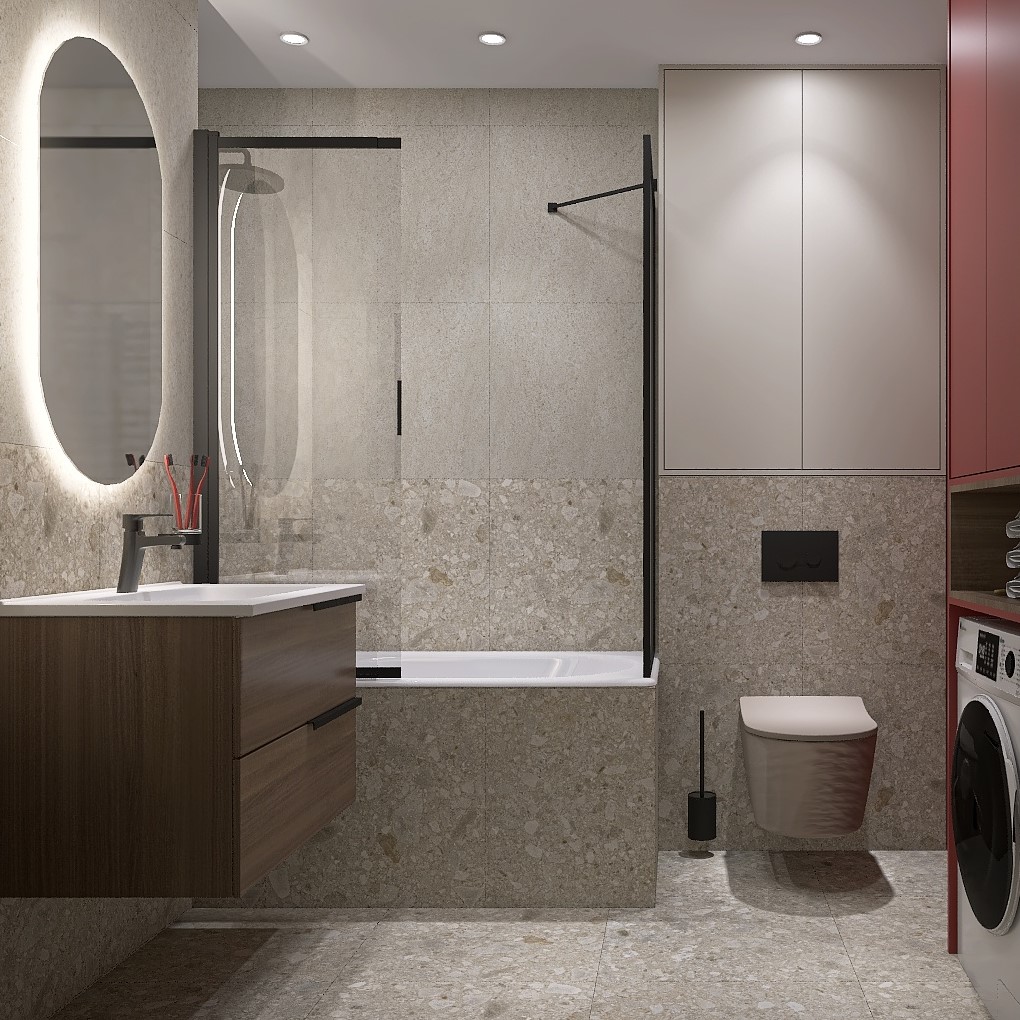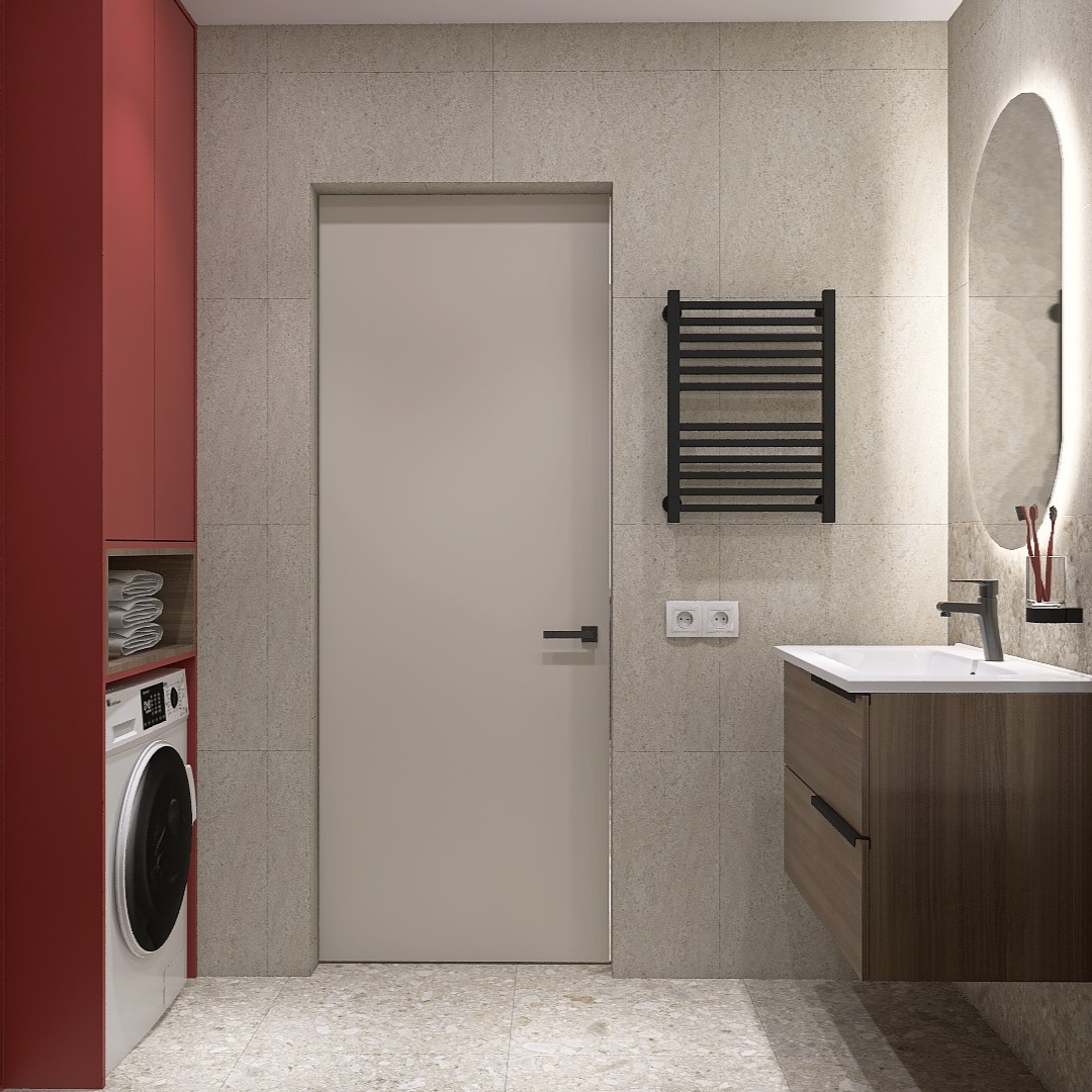 Проект вдохновлен природой: терраццо символизирует землю, а яркий шкаф - энергию солнца. Стены разделены на две части: нижняя - терраццо, верхняя - травертин. Деревянная тумба подчеркивая естественность. Пол из терраццо завершает образ. "Тепло Земли и Солнца" - это уютное пространство, где природа встречается с современным дизайном.