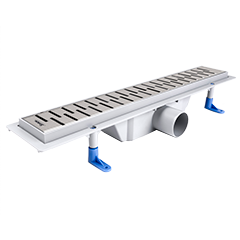 - Лотки с решеткой Это классический вариант, при котором сверху лотка устанавливается решетка для предотвращения попадания крупных частиц мусора. Такие лотки идеально подходят для использования в душевых зонах с высокой проходимостью.